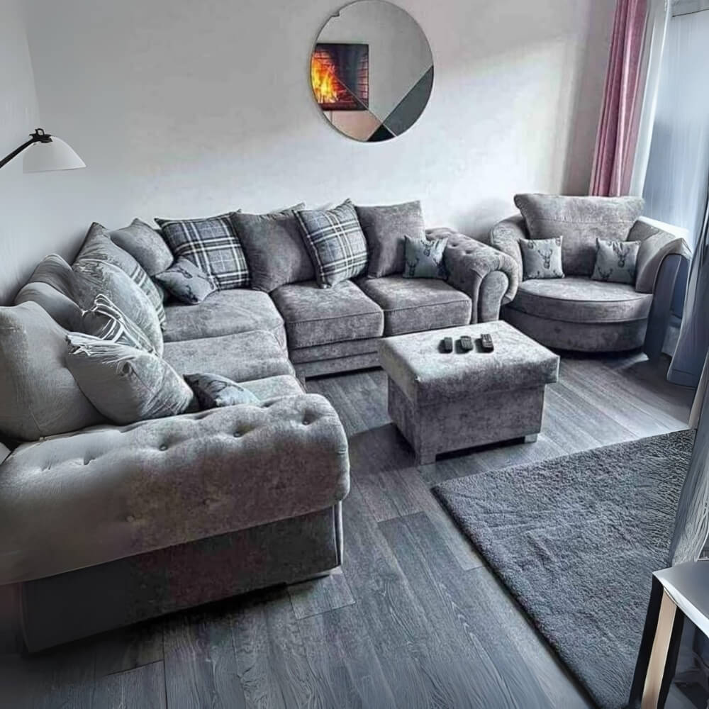 This Verona Corner Sofa Set with , Cuddle Chair & Footstool – Full Package comes in high-quality  Grey fabic and stylish grey finish. The sofa is delivered in separate parts, making it easy to move through any doorway. Delivery within 2–4 working days across the UK.